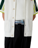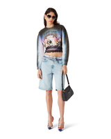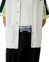 The La Premonition belt is a design featuring the house's seasonal artwork inspired by an eerie vision of the skyline of LA at night, with UFO elements touching on vintage sci-fi inspiration, crafted from calf leather. Completed with a painted brass buckle featuring hand-drawn typography of the Casablanca logo, inspired by the gothic typeface used in tattoos, in the season's gradient, and a skull.