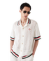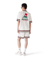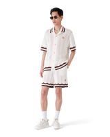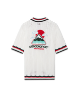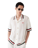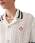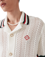 The Montagne Ondulee crochet shirt is a short-sleeve knitted design crafted from crochet cotton fabric and features the house's signature diamond logo and seasonal artwork - using Japan's rich iconography as inspiration for this collection, with a simple layout and artwork, conveying a strong visual message with just a few lines and colours, making it one of the emblems of the collection. Completed with button closure, signature gold rim pearl buttons, and ribbed striped edge detail on the collar, cuffs and hem.