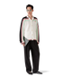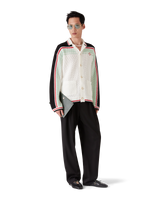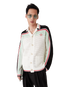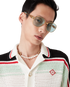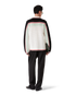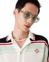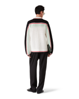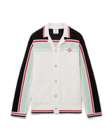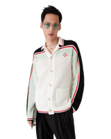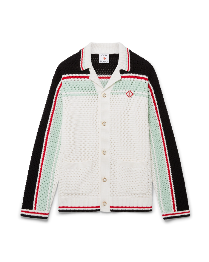 The cotton tennis crochet shacket is a long-sleeved textured design crafted from a crochet cotton fabric featuring the house's signature diamond logo, tying back to the capsule’s travel and vacation theme. Completed with a rib collar, cuffs, hem and placket, front patch pockets, button closure, signature gold rim pearl buttons, and black, red, mint, and white stripe detail across the chest, back, and down the sleeves, and striped edge detail on the cuffs, hem and collar.