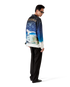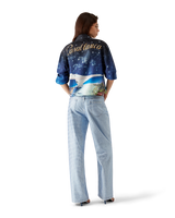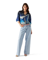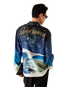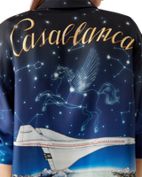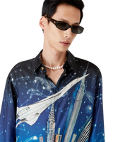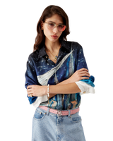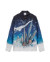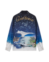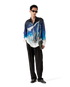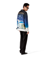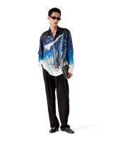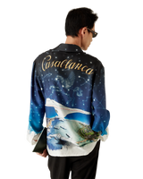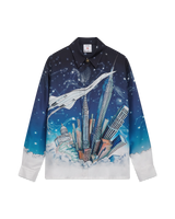 The Vol De Nuit silk shirt is a long-sleeve all-over printed design featuring artwork paying homage to the fantasy and surrealism of both the house and Charaf Tajer’s birthplace, Paris, crafted from silk twill fabric. Completed with a collar, button closure, interlocking CC logo corozo buttons, and signature gold rim pearl buttons at the collar and on the cuffs.