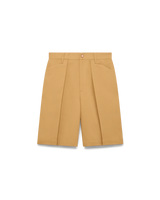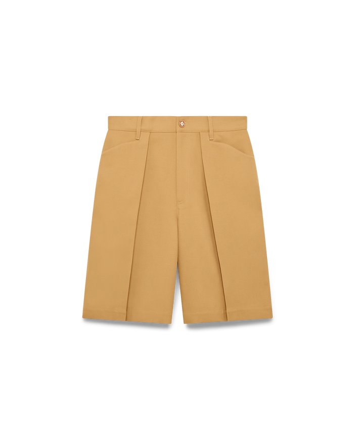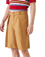 The wool pleated shorts are a relaxed design crafted from cotton twill fabric and feature a cotton lining. Completed with belt loops, a zip closure, front pockets, and welt back pockets with interlocking CC logo gold rim enamel button closure.