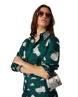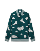 The Metaphysical silk shirt is an all-over printed design, crafted from silk twill fabric, featuring artwork depicting core design elements. Completed with signature gold rim enamel buttons on the cuffs and collar, front button closure with interlocking CC corozo buttons, peak collar, and stripe details on the collar, cuffs and hem.