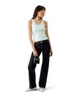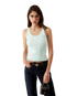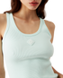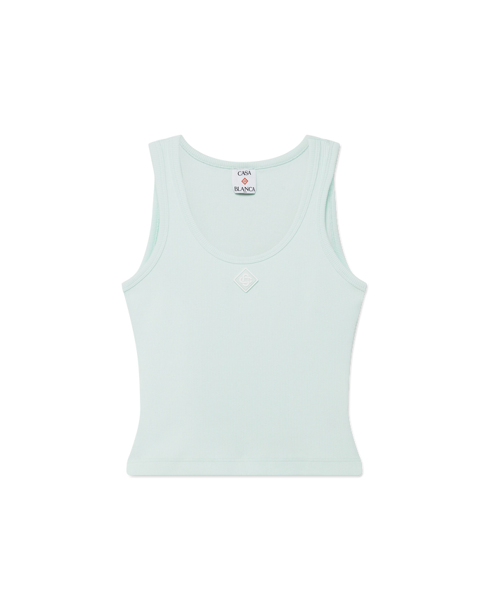 The ribbed jersey tank top is a sleeveless fitted short-style, crafted from ribbed jersey fabric. Completed with a silicon interlocking CC logo patch, a scoop neck, and white contrast wave pattern detail edges around the neck and armholes.