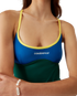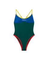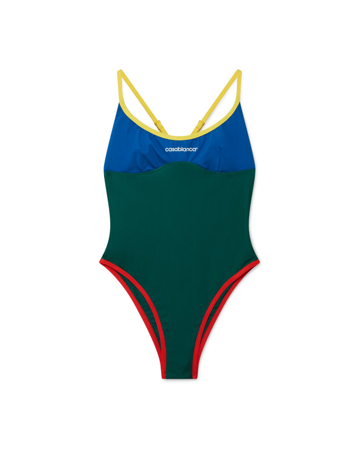 The colourblock swimsuit is crafted from a breathable technical swim fabric, featuring the house's Casablanca logo on the chest. Completed with contrast trims, high-cut legs, a scoop neck, and a cut-out back.