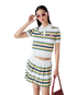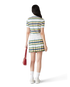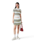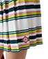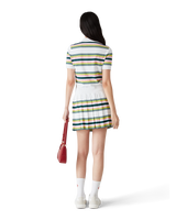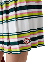 The stripe pleated skirt is a mini-style crafted from a stripe fabric. Completed with an elasticated waistband, pleats, green, pink and blue horizontal stripes, side zip closure, and fitted under-shorts.