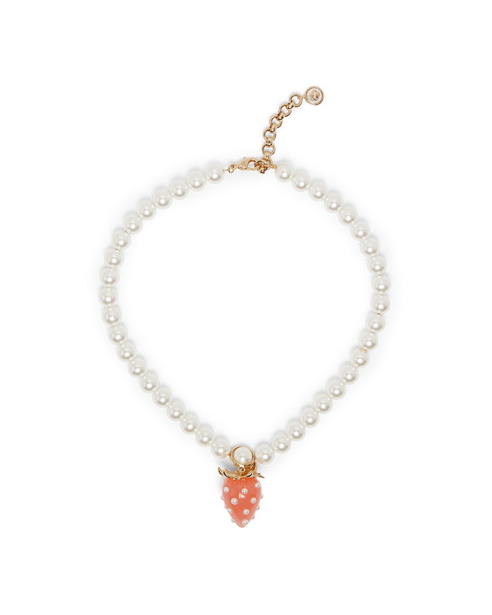 The strawberry necklace is a refined design crafted from gold-plated brass and faux pearls. Completed with a classic chain construction, a pink strawberry charm, lobster clasp and adjustable chain.