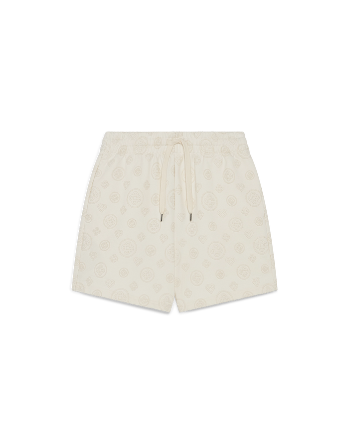 The appliqué monogram sweatshort is a refined design featuring the house's Icon print. Completed with an elasticised waistband, silver-tipped drawstring fastening , a lining, in-seam side pockets, and a back patch pocket. These sweatshorts embody the house's elevated sportswear codes.