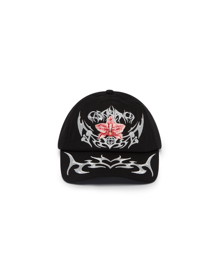 The black Blades cap is a classic baseball style crafted from cotton twill fabric featuring this season's Blades artwork that plays with the contrast between two opposing feelings - the sharpness of the blade and the cold, silver chrome, contrasted with the warmth of nature, like the bold pink and red tones of an orchid flower. The addition of water droplets brings a fresh, crisp element to the design. Completed with a peak and gold-plated adjustable buckle.