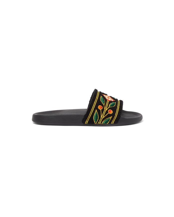 The laurel terry sliders are crafted from an embroidered terry fabric and feature the house's diamond logo and signature Laurel artwork on its uppers. Completed with padded rubberised soles.