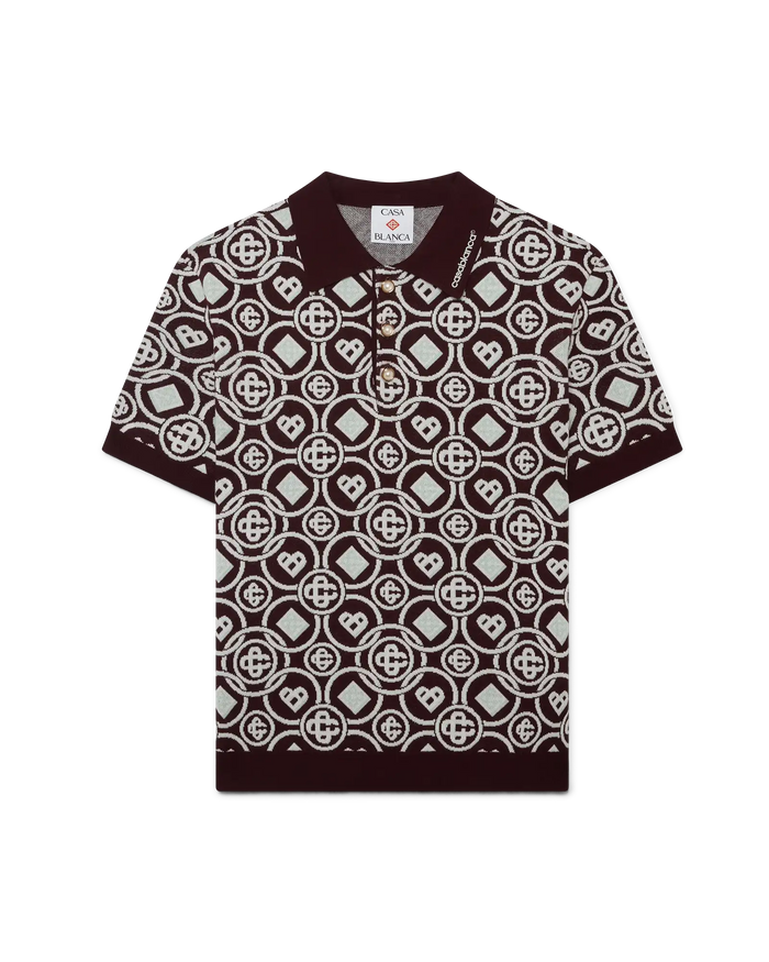 The monogram cotton knit polo shirt is a short-sleeve design featuring the season's new Honeydrew logo repeat - this repeat differs from our other monograms, as it combines unique shapes to form a cohesive pattern. It is more of an icon-based design. Completed with button closure, signature gold rim pearl buttons, and a rib collar, cuffs, and hem detail.