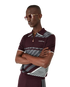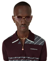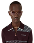 The merino diagonal tennis polo is a knitted short-sleeve design featuring diagonal sport stripes and an embroidered Casablanca logo. Completed with a quarter zip closure with signature diamond logo zipper tab, a rib collar, and contrast edge detail on the collar and cuffs