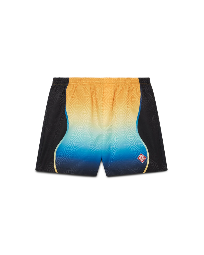 The gradient jacquard swim shorts are a printed design featuring a gradient inspired by the vivid and striking natural hues of poison dart frogs, the bold shades of blue to yellow signify a warning in nature and are used with the same attention-grabbing intention within our prints. Completed with an elasticised waistband, internal drawstring fastening, a mesh lining and an internal pocket.