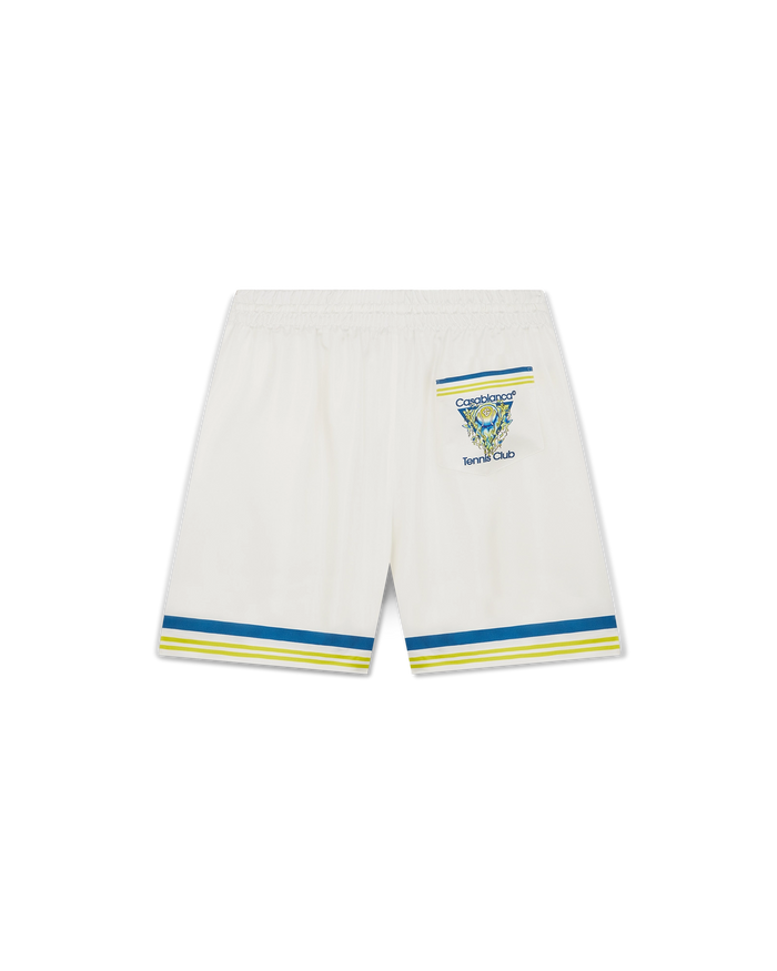 The Flaming Tennis Club Icon silk shorts are a printed design, featuring artwork of the house's distinctive tennis ball motif in flight, reflecting the fundamental balance of power, speed and control. Completed with an elasticised waistband, drawstring fastening, in-seam side pockets, and a back patch pocket.