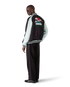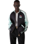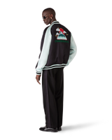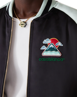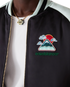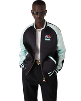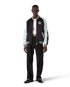 The embroidered satin bomber jacket is a traditional bomber-style jacket, crafted from satin fabric featuring artwork using Japan's rich iconography as inspiration, conveying a strong visual message with just a few lines and colours, making it one of the emblems of the collection. Completed with a zip closure featuring the house's signature diamond logo zipper tab, raglan sleeves with green and black panels and piping details, a lining, diagonal welt pockets, and a rib stand-up collar, cuffs and hem with mint and black stripe detail.