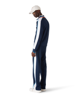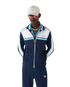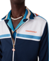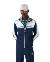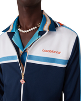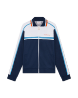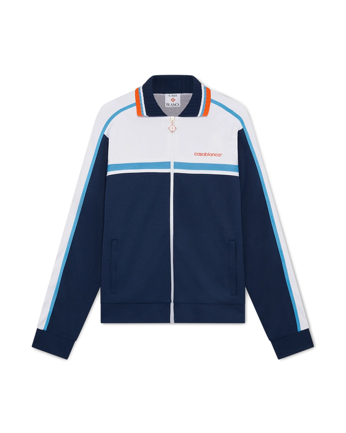 The pique track jacket is a classic sportswear design crafted from a round pique fabric. Completed with a rib collar, navy and white colour blocks, stripe detail across the chest, zip closure, rib cuffs and hem, and a mesh lining.