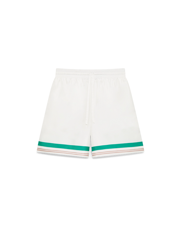 The Casa Way silk shorts are a printed design crafted from silk twill fabric. Completed with an elasticised waistband, drawstring fastening, in-seam side pockets, a back pocket, and striped hem and pocket detail.