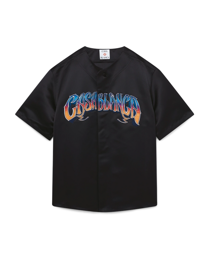 The Gothic baseball shirt is a short-sleeve design crafted from satin fabric and features the house's Casablanca logo. Completed with button closure, interlocking CC logo corozo buttons, and hand-drawn typography of the Casablanca logo in the season's gradient, inspired by the gothic typeface used in tattoos.