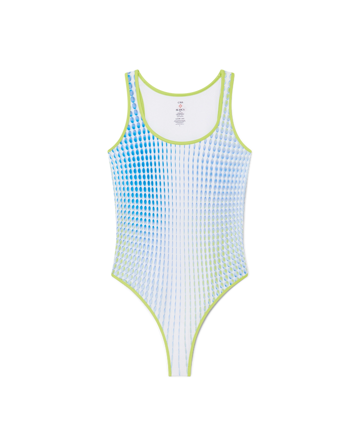 The Gradient printed swimsuit is a one-piece design featuring the season's unique artwork created in collaboration with Martin Naumann, known for his work blending gradient and texture effects with halftones and glass-like effects. Completed with contrast edge trim, high-cut legs, a cut-out back and a scoop neck.