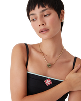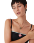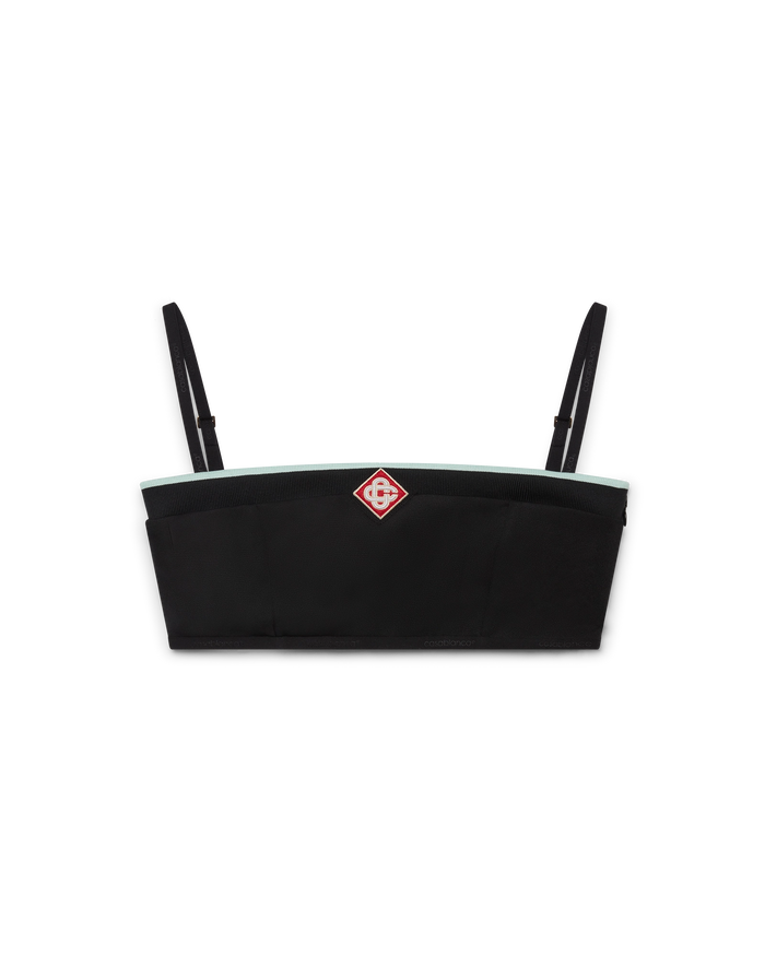 The tricot bralette is a sleeveless sportswear-inspired design featuring the house's signature diamond monogram at its centre. This piece is crafted from a tricot fabric, completed with spaghetti straps and striped edge details.