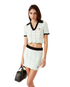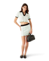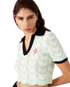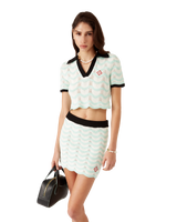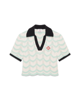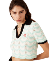 The cotton wave crochet cropped polo is a short-sleeve design featuring the house's signature diamond logo crafted from crochet cotton fabric. Completed with a V-neck, a collar, a wave-inspired hemline, and black contrast rib placket, cuffs and collar - designed to fit above the navel.