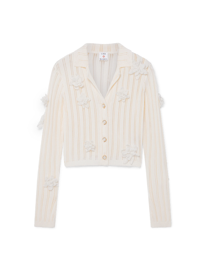 The flower lace knit shirt is a long-sleeve design crafted from lace knit cotton fabric. Completed with bell sleeves with slit detail, a collar, button closure, signature gold rim pearl buttons, and floral motif appliques.
