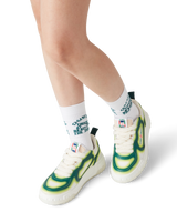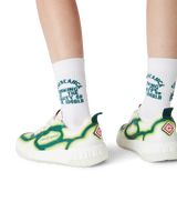 The design language of the Court Sneaker reflects the iconic silhouettes of the 90s. The colours featured throughout the rubber sole are a combination of the refined codes of tennis and classic architecture and create a unified palette throughout the shoe, with the focus on primary colours offset by tennis whites to create a sports focus colour story. The upper of the shoe features integrated, flowing panel lines as a nod to the iconic silhouettes of the 90s. Prominent Casablanca branding throughout is evident, including the brand’s signature diamond motif on the heel, silicone wordmark lateral panelling and the woven tennis court motif tongue label and insole, giving rise to its name, The Court.