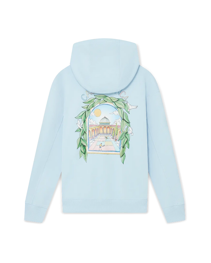 The Casa L'Arche hooded sweatshirt is a refined long-sleeve printed design featuring the house's seasonal artwork with design elements of the arch, nature, architecture, and tennis. Completed with a hood, gold-tipped drawstring fastening, and rib cuffs and hem.