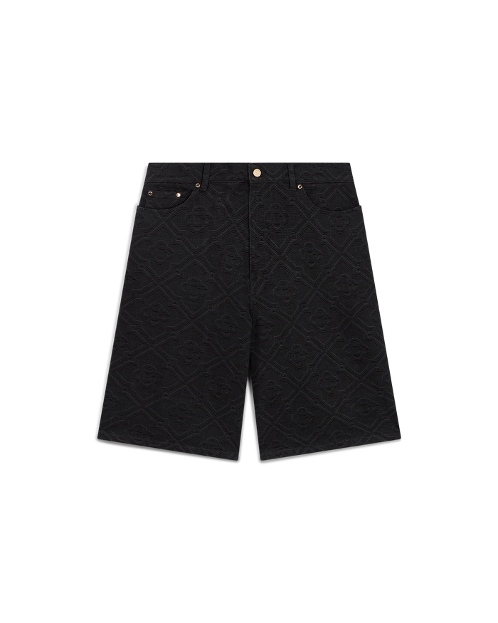 The laser monogram denim shorts are a knee-length design featuring the house's monogram pattern achieved through laser techniques. Completed with jeans-style front pockets, back patch pockets, a button and zip closure, branded gold-plated hardware, and a contemporary silhouette.