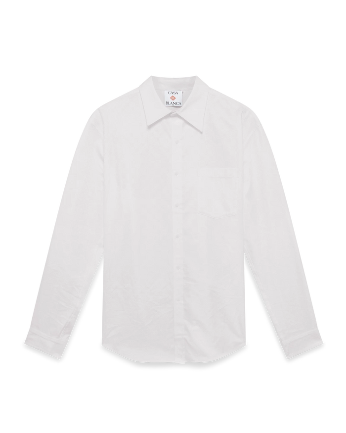 The cotton monogram jacquard Oxford shirt is a classic long-sleeve design. Completed with a breast pocket, a point collar, button closure, interlocking CC logo corozo buttons, and a classic curve hemline.