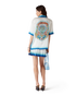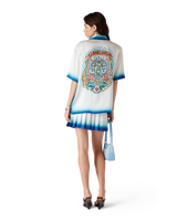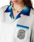 The Casa Way Skate silk shirt is a short-sleeve design crafted from a printed silk satin fabric featuring the season's Casa Way Skate artwork, inspired by classic 70s California skate insignia with a fade-out frame. Completed with a Cuban collar, a breast pocket, hidden button closure with interlocking CC corozo buttons, and edge details on the pocket, collar, cuffs and hem.