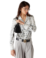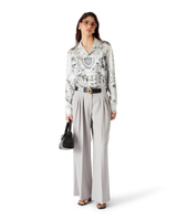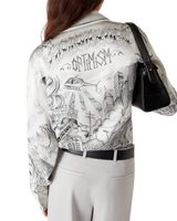The Tattoo silk shirt is a long-sleeve design crafted from a printed silk satin fabric featuring the season's artwork, inspired by the LA neighbourhood scene referencing the rich tattoo culture and the grey and black inks that are used in these tattoos. Completed with a Cuban collar, a breast pocket, hidden button closure with interlocking CC corozo buttons, and a gold rim enamel button on each cuff.