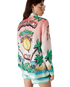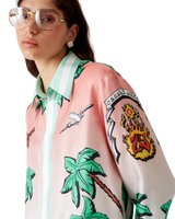 The Tennis Club silk shirt is an all-over printed design featuring artwork reinterpreting the house's Tennis Club print in a surf theme, in the style of a graphic sketch drawn with markers, crafted from silk twill fabric. Finished with a Cuban collar, a breast pocket, hidden button closure with interlocking CC corozo buttons, and a gold rim enamel button on each cuff.