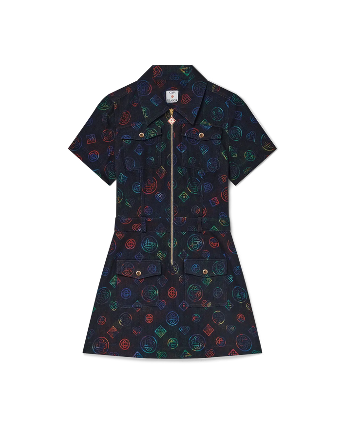 The Heatmap Monogram denim dress is a short-sleeve A-line mini-style dress, crafted from cotton denim fabric featuring the season's distinctive heatmap artwork. Completed with a front zip closure featuring the house's signature diamond logo zipper tab, belt loops, flap pockets, and branded gold-plated hardware.