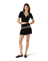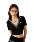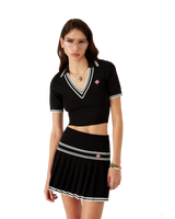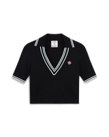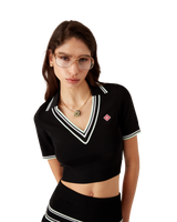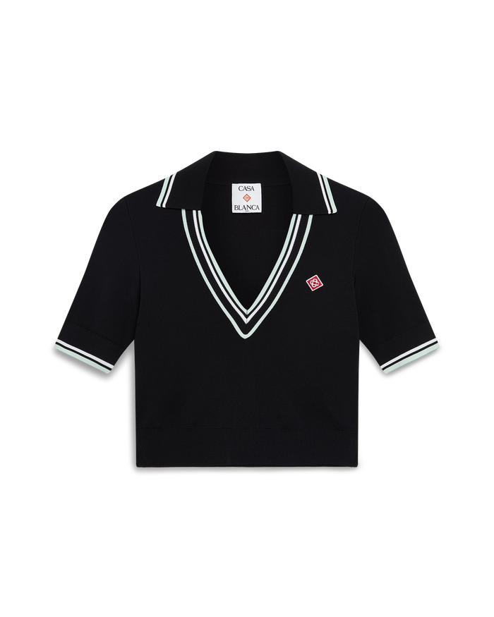 The Viscose V-neck polo shirt is a cropped style crafted from a knitted fabric featuring the house's signature diamond logo. Completed with rib collar, cuffs and hem with contrast green and white stripe details and a deep v-neck.