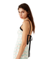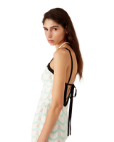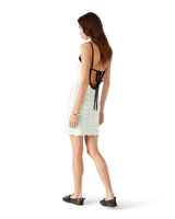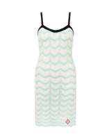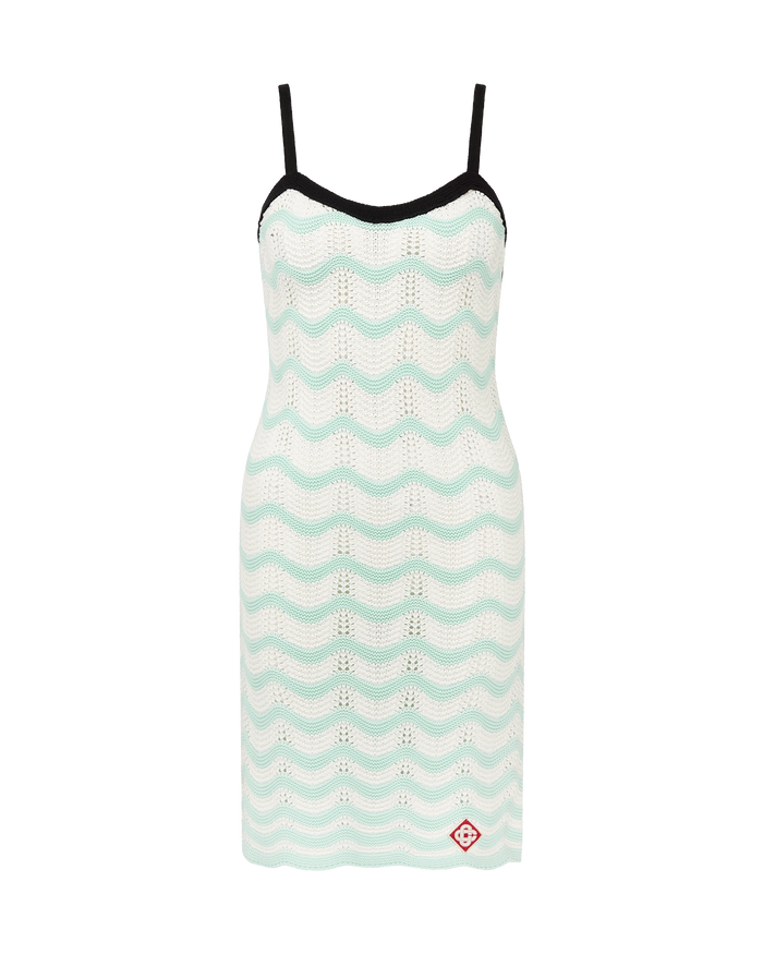 The wave crochet mini dress is a sleeveless design featuring the house's signature diamond logo crafted from crochet cotton fabric. Completed with a low back, a Memphis wave-inspired hemline, black contrast trim and spaghetti straps that fasten at the back.