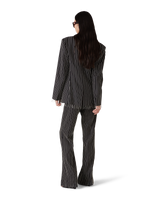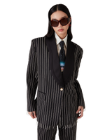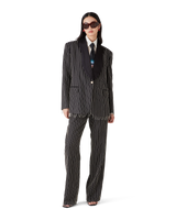 The crystal embellished tailored jacket is a single-breasted design crafted from silk tailoring fabric and crystals. Completed with a button closure, a signature gold rim pearl button, flap front pockets, a back vent, lapels, and a lining.