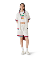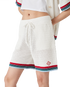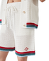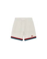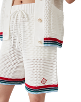 The gothic crochet shorts are a soft textured design crafted from knitted cotton fabric, featuring the house's signature diamond logo. Finished with a ribbed elasticated waistband with drawstring fastening, side pockets, and contrast stripe edge detail on the hem.