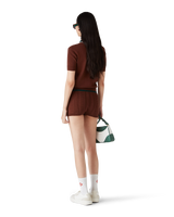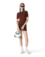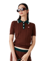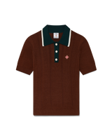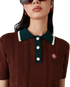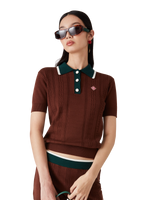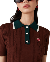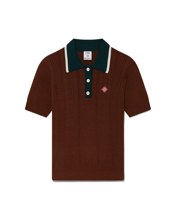 The cable knit polo shirt is a short-sleeve design crafted from knitted cotton fabric featuring the house's signature diamond logo. Completed with flat shank CC logo buttons, a three-button placket, a contrast rib placket and collar, with white edge detail on the collar. Designed to be worn with its coordinating cable knit mini shorts.