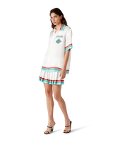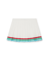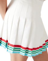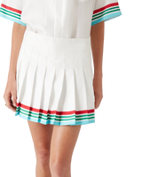 The Casa Way World Series pleated skirt is a mini-style crafted from silk twill fabric. Completed with a plain waistband, pleated panel, a red, white, green, and blue horizontal stripe hem detail, side zip closure, and a lining.