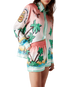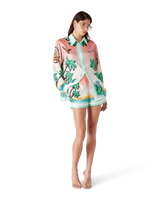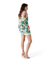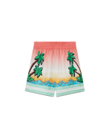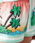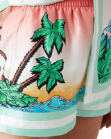 The Tennis Club silk shorts are an all-over printed design featuring artwork reinterpreting the house's Tennis Club print in a surf theme, in the style of a graphic sketch drawn with markers, crafted from silk twill fabric. Finished with an elasticated waistband, in-seam side pockets, a back patch pocket, and green and white horizontal stripes hem detail.